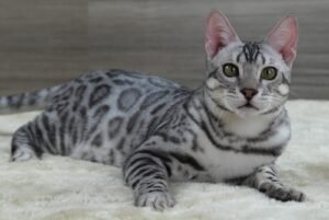 Silver Bengals are striking — a sleek, shimmering coat with a silvery-white background and bold black or dark gray markings that seem to glow from within. That silver effect isn’t a true color but the result of color suppression, which means it can combine with other coat patterns and colors. On brown Bengals it produces the classic silver look; on reds, a softer cameo; on melanistic Bengals, a smoky depth; and on snows, a sharp icy-silver.
